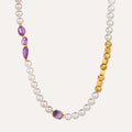 Discover our beautiful pearl necklace with purple stones and gold accents. Ideal for any occasion, from daily outfits to special events.Â